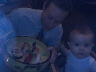 Musashino, to have some yummy, healthy sushi. Emmylou likes to chew on the empty edamame shells so I took a picture of her doing that next to her daddy's plate: